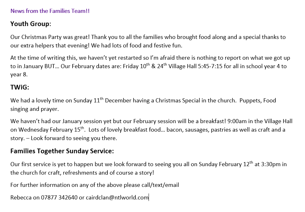 Mrs Rebecca Caird (Children and Families Worker) on 07877 342640